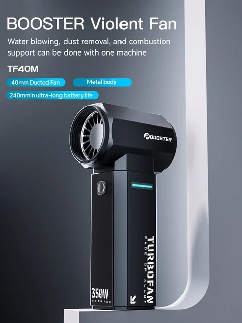 جتفن Booster TF40 M با سایز ۴۰ میلیمتر (ابعاد کلی تقریباً ۱۵۴×۷۴×۴۷٫۵ میلیمتر) و ساختار آلیاژ آلومینیوم CNC، یک دستگاه پرقدرت برای دمیدن، مکش یا استفاده در شرایط خاص نظافتی، صنعتی، کمپینگ یا خودرو است. این مدل با سرعت موتور حدود ۸۰٬۰۰۰ دور در دقیقه و نیروی پرتاب باد/یا «تراست» تا ۵۰۰ گرم طراحی شده است.
