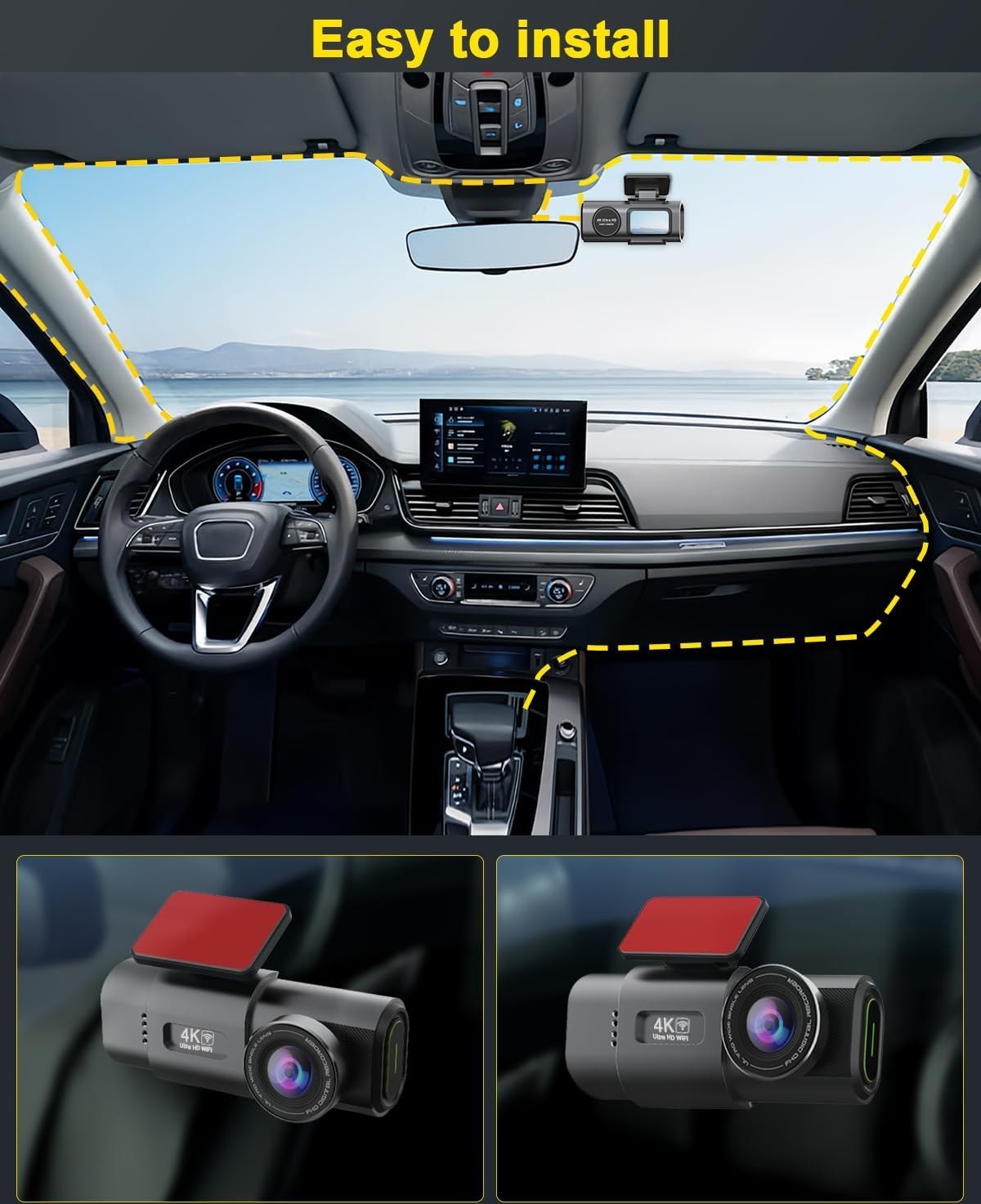 دوربین خودرو دو دوربین 4K وای فای دار مجهز به دوربین های جلو و عقب است که می توانند به طور همزمان ضبط کنند. دوربین جلو از رزولوشن 4K پشتیبانی می کند و می تواند جزئیات جاده را به وضوح ثبت کند. دوربین عقب این دستگاه از وضوح 1080P فول اچ دی پشتیبانی می کند، در مقایسه با اکثر دوربین های عقب که تنها 720P یا حتی 480p هستن کیفیت بسیار بالاتری دارد و می تواند اطلاعات بسیار واضح تری از جاده پشت خودرو از جمله پلاک خودرو را ثبت کند.