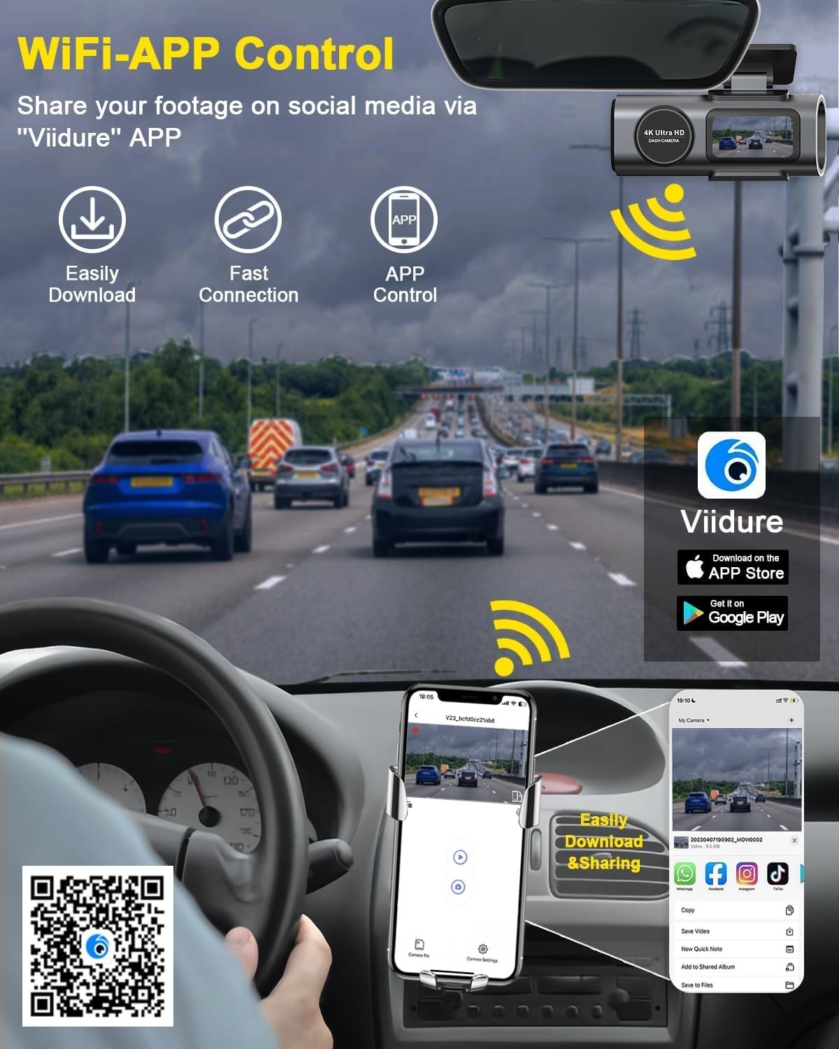 این دستگاه دوربین خودرو می تواند از طریق WiFi به تلفن همراه شما متصل شود. شما می توانید به فیلم ها در دستگاه های IOS یا Android دسترسی پیدا کرده و این فیلم ها را ببینید و ذخیره کنید ، همچنین می توانید سفر خود را با دوستان یا بستگان خود در رسانه های اجتماعی به اشتراک بگذارید. همچنین می توانید به راحتی از طریق نرم افزار دوربین را کنترل کنید و از کار با دکمه های دوربین خلاص شوید.