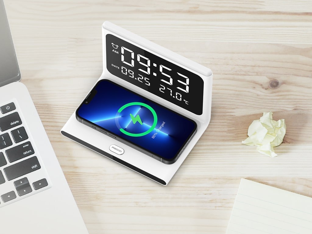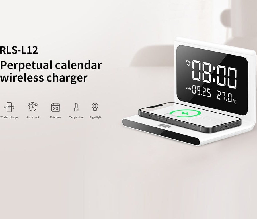 شارژر بی‌سیم و ساعت رومیزی رسی مدل RLS-L12 | ترکیب زیبایی و کارایی در یک دستگاه