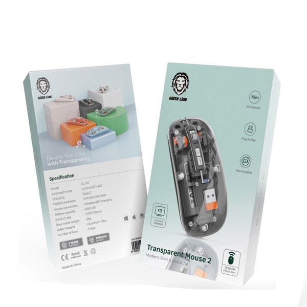 ماوس بی سیم شیشه ای مدل Transparent mouse محصول از ظاهر بسیار خاص و زیبایی ساخته شده که همین ویژگی موجب می‌شود تا هر فردی را به خود جذب کند. نوع اتصال آن نیز بی‌سیم و نوع رابط آن به صورت بلوتوثی و USB دانگل بوده که هیچگونه مزاحمتی برای کاربران عزیز حین استفاده ایجاد نمی‌کند. این ماوس شیشه‌ای بلوتوثی از محدوده دقت 800 الی 2400  DPI برخوردار بوده که موجب افزایش کیفیت آن هنگام استفاده می‌شود. یکی از بهترین ویژگی‌های این محصول، ظرفیت باتری 400 میلی آمپر آن است که این امکان را می‎دهد تا مدت زمان طولانی بدون نیاز به شارژ قابل استفاده باشد.