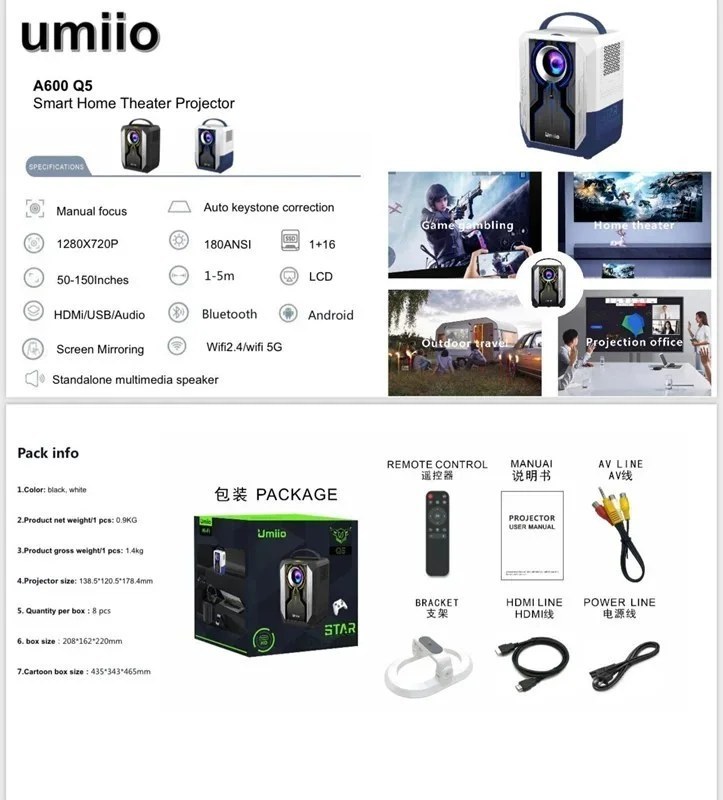پشتیبانی از بلوتوث ۲.۴ گیگاهرتز و ۵ گیگاهرتز نیز ، اتصال سریع و بینقص انواع دستگاه را تضمین مینماید . همچنین با وجود 1 گیگابایت رم تصاویر بدون تاخیر پخش خواهند شد . 16 گیگابایت حافظه داخلی به شما این امکان را میدهد که محتوای مورد نظر خود را ضبط نمایید . این قابلیت برای طرفدارن گیمینگ بسیار اهمیت داردUmiio Projector Q5. از طیف گستردهای از پورتها و ورودیها پشتیبانی میکند که امکان اتصال به دستگاههای مختلف را برای کاربران فراهم میسازد . پورت HDMI برای اتصال به کنسولهای بازی، لپتاپ و پخشکنندههای رسانهای ، پورت USB برای نمایش مستقیم محتوا از روی فلش مموری یا هارد اکسترنال و ورودی AV برای اتصال به دستگاههای قدیمیتر به کار میروند . تصحیح خودکار کیستون و قابلیت فوکوس دستی ، تصویری صاف و مطلوب را برای تماشای فیلم و یا انجام بازی ، فراهم میکند . یکی دیگر از قابلیتهای برجسته این مدل، سیستم صوتی پیشرفتهای است که امکان تولید صدای شفاف و باکیفیت را فراهم میکند . بلندگوهای Hi-Fi دوگانه به کاربر اجازه میدهند تا بدون نیاز به استفاده از تجهیزات جانبی اضافی، صدایی واضح و فراگیر را تجربه کند . ویدئو پروژکتور 4K یومیو مدل Umiio projector Q5 مستقیما به برق متصل شده و به همراه ریموت کنترل ، کابل HDMI و کابل AV و پایه مخصوص به فروش میرسد .