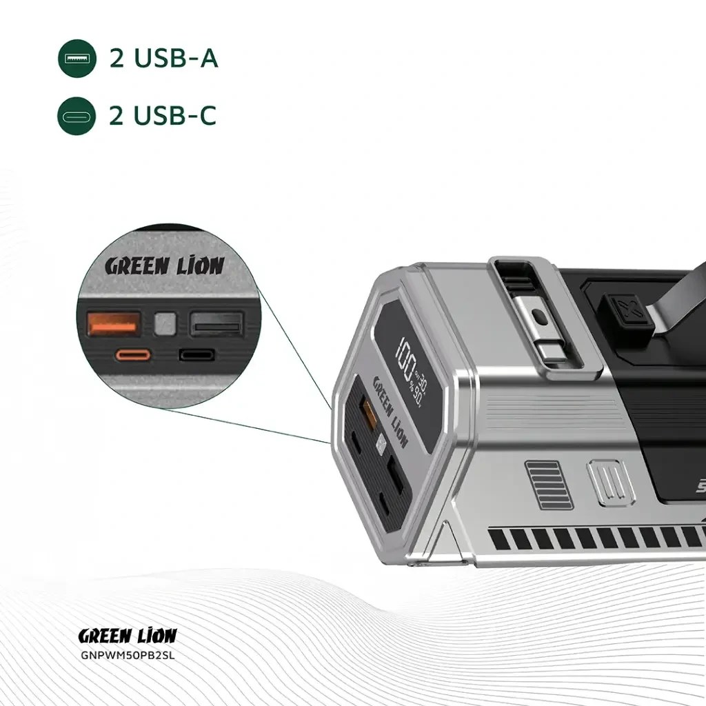 پاوربانک Green Lion GNPWM50PB1SL محصولی باکیفیت از برند گرین لاین است که می‌تواند تجربه شما را از سفرهای برون شهری و کمپ در جنگل و کویر متحول کند. بدنه این پاوربانک از موادی ساخته شده است که مقاومت بالایی دارد. ابعاد این پاوربانک 77×59×167 میلی متر بوده که برای پاوربانکی با ظرفیت 50 هزار میلی آمپر ساعت و امکانات متعدد ابعادی مناسب است. همچنین وزنی نزدیک به 1.1 کیلوگرم دارد. که این وزن بالا به دلیل کیفیت بالای قطعات به کار رفته در آن است. در سمت بالای بدنه این محصول نیز یک دسته قرار دارد که برای حمل ساده‌تر آن قابل استفاده است. همچنین یک چراغ نیز در وجهی از بدنه پاوربانک Green Lion GNPWM50PB1SL قرار گرفته است.