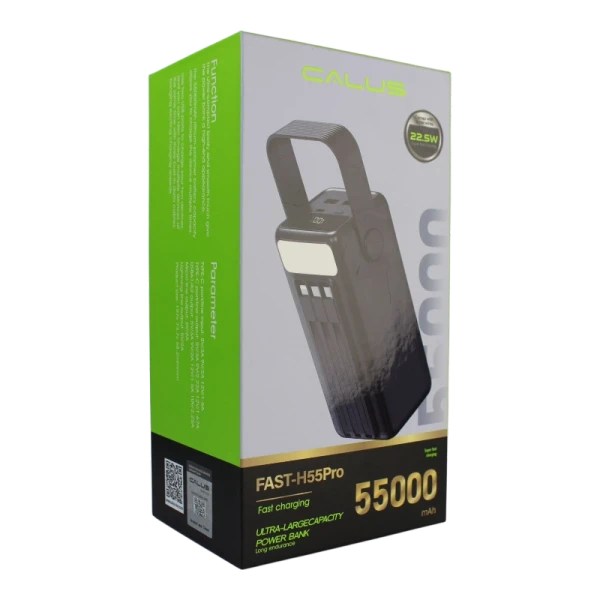 پاوربانک CALUS FAST-H55 Pro یک انتخاب قدرتمند برای افرادی است که به ظرفیت بسیار بالا و شارژ سریع نیاز دارند. این پاوربانک با طراحی مقاوم و دستگیره حمل، مناسب سفر، کمپینگ و استفاده روزمره سنگین است.