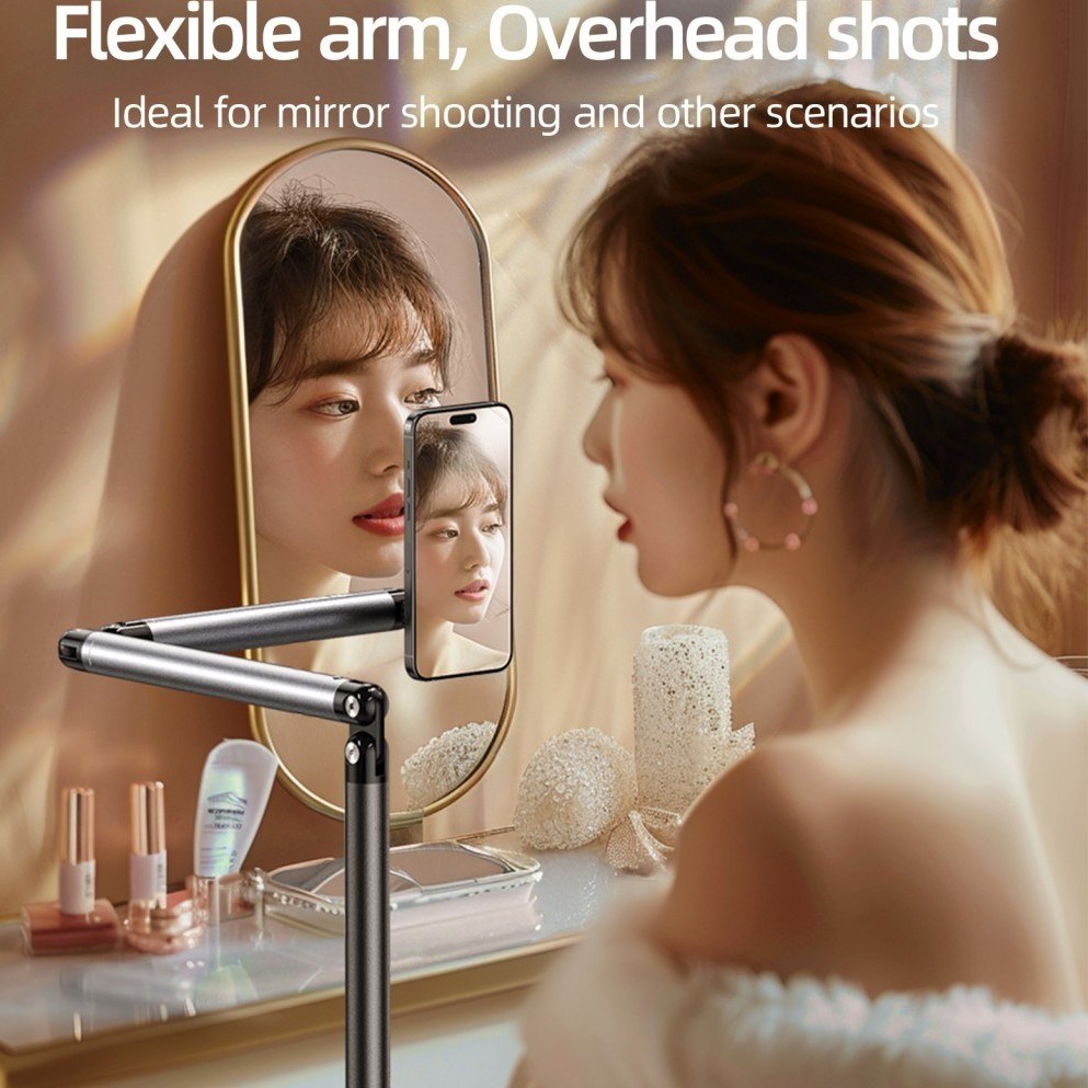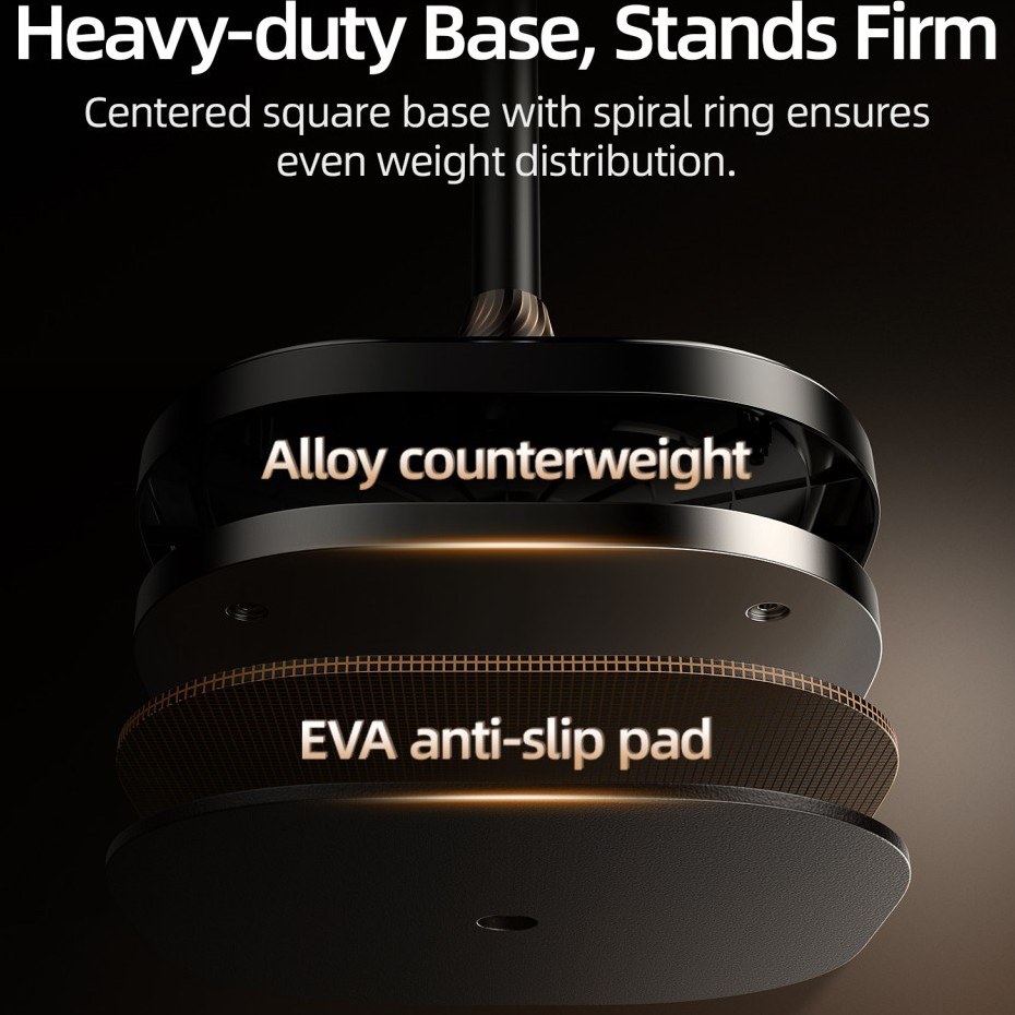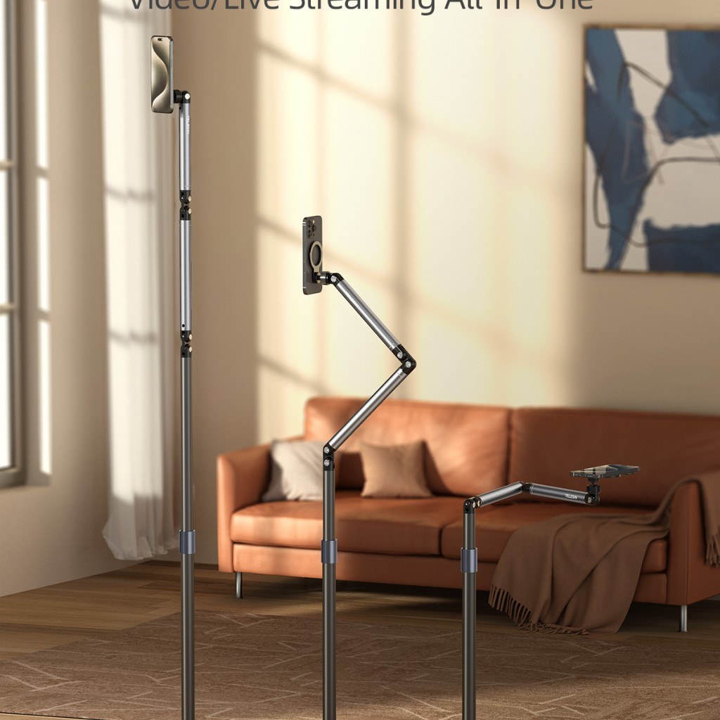 قابلیت چرخش ۳۶۰ درجه و ارتفاع قابل تنظیم بین ۶۰ تا ۱۶۰ سانتیمتر این هولدر را به گزینهای همهکاره تبدیل کرده است. علاوه بر این، پایه فلزی با پد ضدلغزش EVA، ثبات بسیار بالایی حتی روی سطوح لغزنده ایجاد میکند.